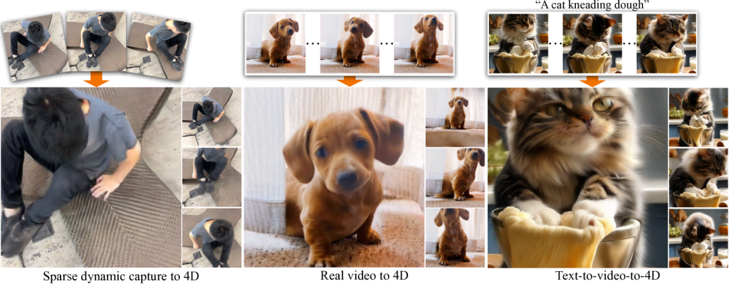 The image below illustrates CAT4D’s capability to create 4D scenes from just 3 real or synthetic images or video frames.