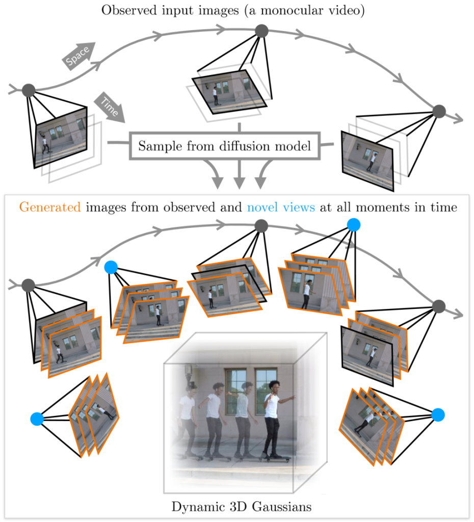 - Stage 1: A monocular video is input into a multi-view video diffusion model. This model generates multiple views from different angles and time points, effectively simulating a multi-camera setup.