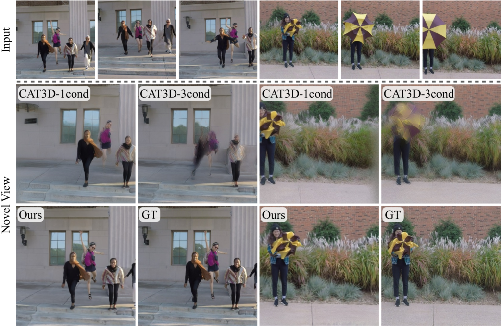 The model was tested on creating 3D scenes from a few images in a bullet-time effect, where time slows down, and the camera moves around the scene. As shown below, CAT4D produces reconstructions that are more accurate and closer to the ground truth (GT) compared to CAT3D-1cond and CAT3D-2cond.