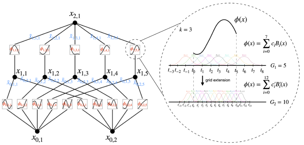 The picture below shows a KAN neural network that dynamically adapts its activation functions to better capture the complexities of the data it is learning from. It’s a more advanced and flexible method compared to traditional neural networks, which typically use fixed activation functions.