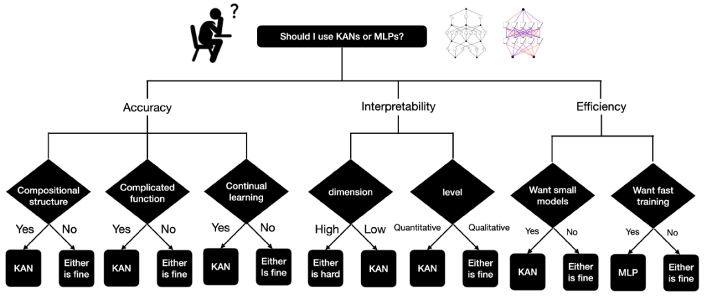 At present, the primary challenge with KANs is their prolonged training time. They tend to train about 10 times slower than MLPs with an equivalent number of parameters. The slow training pace of KANs is considered a technical issue that can be addressed in future developments.The next flowchart helps you decide between KANs and MLPs.