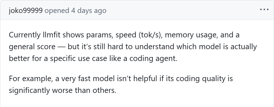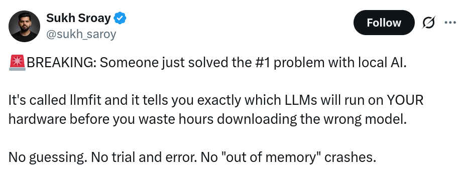 Unlike generic model directories like Hugging Face or Ollama’s library, which require manual selection and testing, llmfit automates hardware profiling and dynamic scoring across quality, speed, fit, and context dimensions. Traditional tools like lmfit-py focus on curve fitting, not LLM deployment, while alternatives such as llm-checker benchmark by actually running models but lack preemptive MoE support and comprehensive estimation for 497 models.