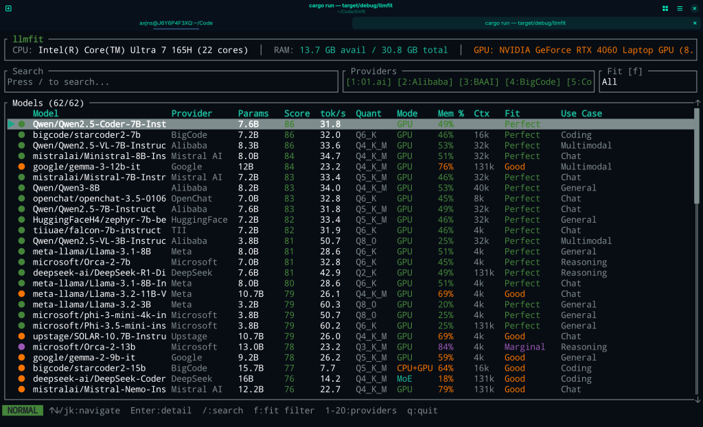 llmfit includes backend detection for CUDA, Metal, and ROCm, awareness of quantization levels (such as Q8_0 through Q2_K), and support for architectures including mixture-of-experts (MoE) models. Its interactive TUI allows filtering and exploration directly in the terminal, while structured output formats such as JSON enable integration into automation pipelines or agent workflows.