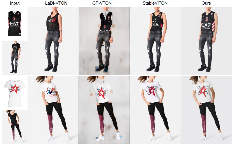 - Traditional LDM-based methods often rely on the warping techniques to fit the garment onto the person’s image. This approach can lead to unnatural-looking results where the garment appears “pasted” onto the body and intricate details might be lost.