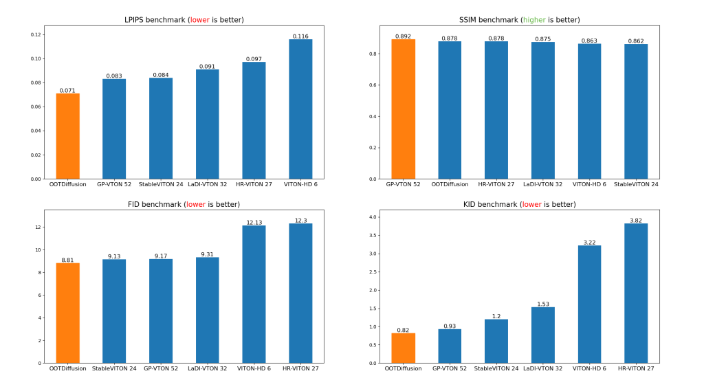 For the quantitative evaluation, OOTDiffusion was tested at a resolution of 512 × 384, even though it can support higher resolutions up to 1024 × 768. This was done to ensure a fair and consistent comparison with previous virtual try-on (VTON) methods. Some of the results are presented in the following chart. The metrics LPIPS, SSIM, FID, and KID are used to evaluate the quality of images generated by the model.